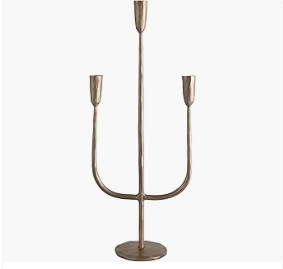 Stylish hand-forged metal candelabra with an antique brass finish. Constructed of metal with an antique brass finish and imperfect texture gives it a unique appearance. A handsomely, eclectic candelabra. A gorgeous piece for your living room, dining room, or bedroom. Holds three standard wax or LED taper candles. Wipe with a clean, dry cloth. 9.5"L x 4"W x 21.5"H