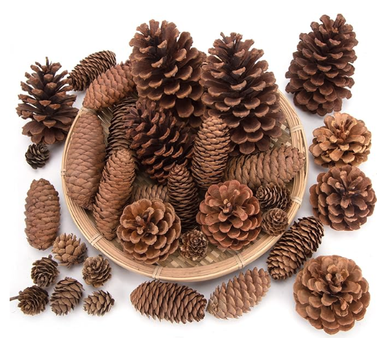 Formula 1: Classic Fall Garland + 3 pumpkins (varied sizes) + 2 tall candlesticks + scattered pinecones + string lights